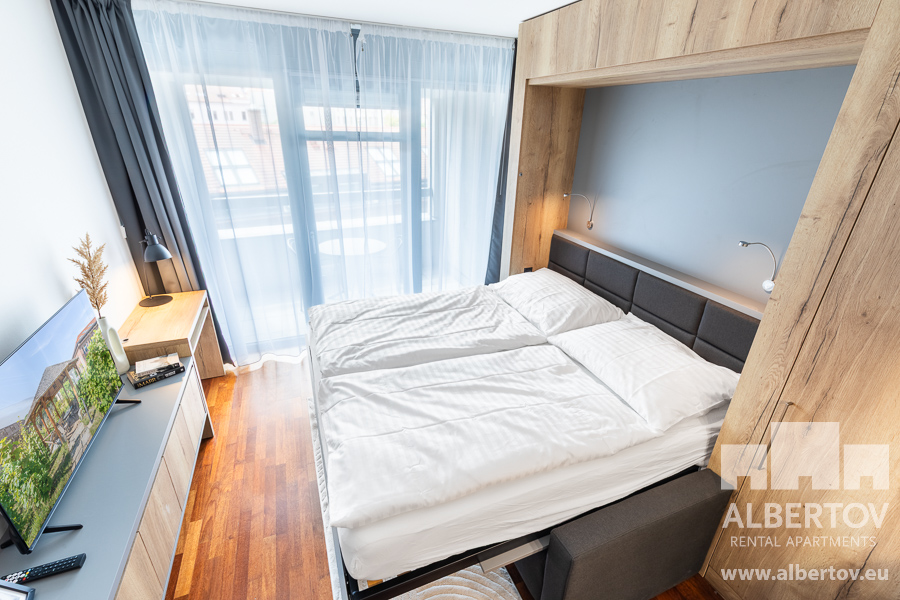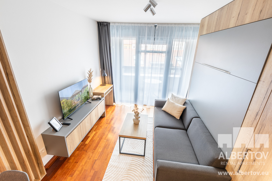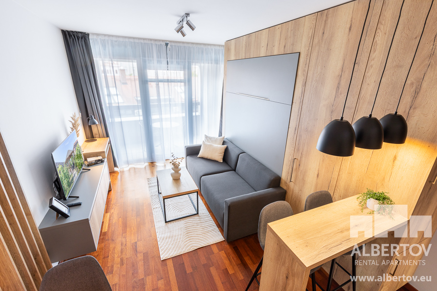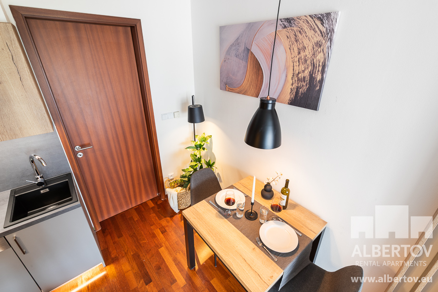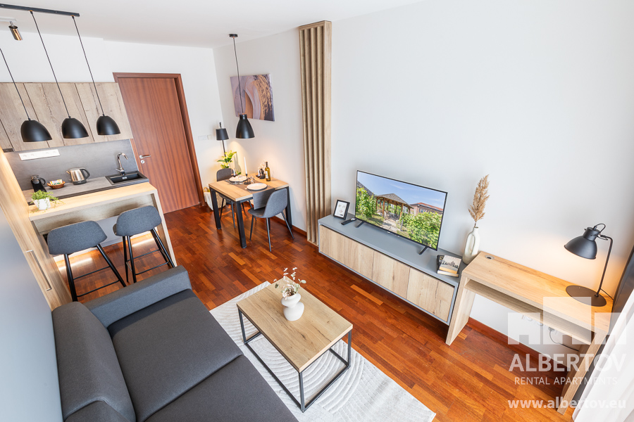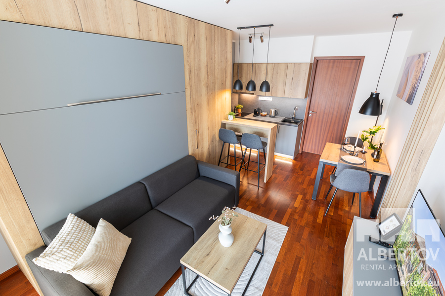 Damit das Wohnen für Sie angenehm ist, ist die ganze Wohnung modern mit Designmöbeln, mit bequemen Hockern und Lehnstühlen, eingerichtet. Im Zimmer gibt es Holzboden mit Heizung und hochwertige Holzfenster, Sie werden sich so gemütlich und warm fühlen! Zur Unterhaltung sorgt der Fernseher mit Satellit mit Hunderten von tschechischen und ausländischen Fernsehkanälen und ein schneller WiFi-Internetanschluss.