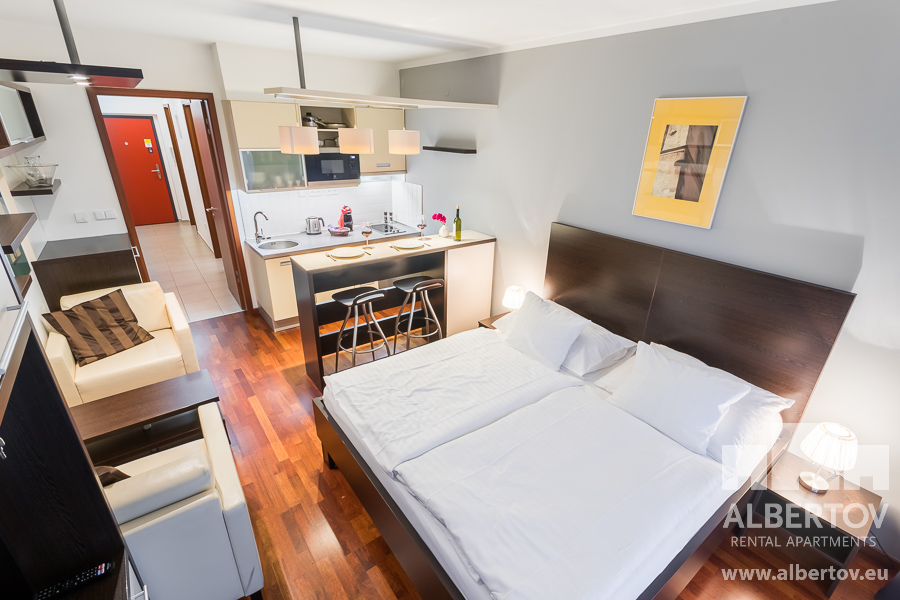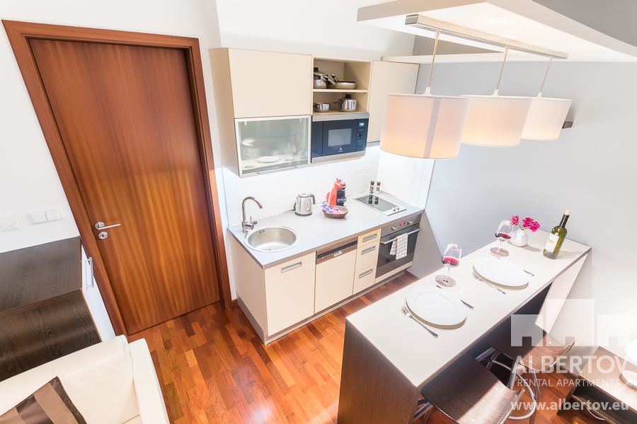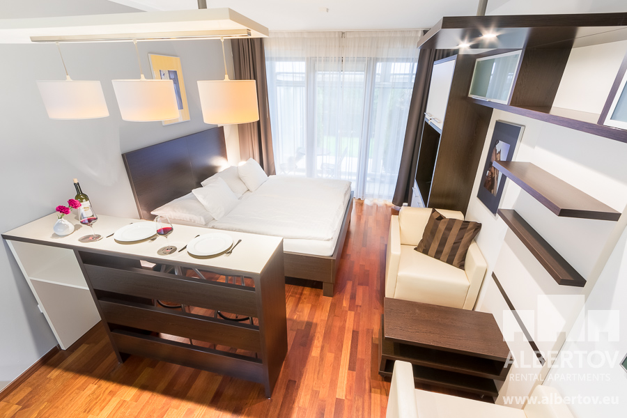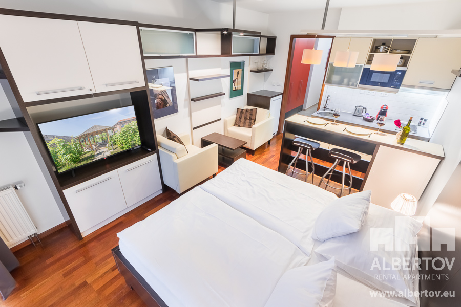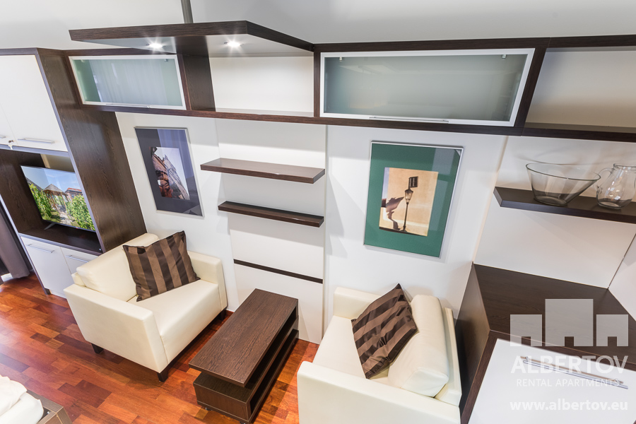 Damit das Wohnen für Sie angenehm ist, ist die ganze Wohnung modern mit Designmöbeln, mit bequemen Hockern und Lehnstühlen, eingerichtet. Im Zimmer gibt es Holzboden mit Heizung und hochwertige Holzfenster, Sie werden sich so gemütlich und warm fühlen! Zur Unterhaltung sorgt der Fernseher mit Satellit mit Hunderten von tschechischen und ausländischen Fernsehkanälen und ein schneller WiFi-Internetanschluss.