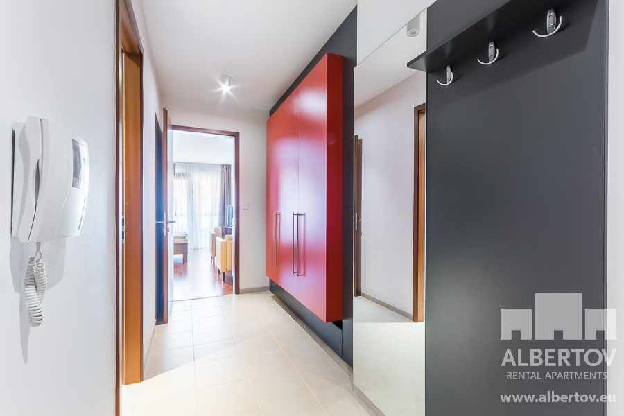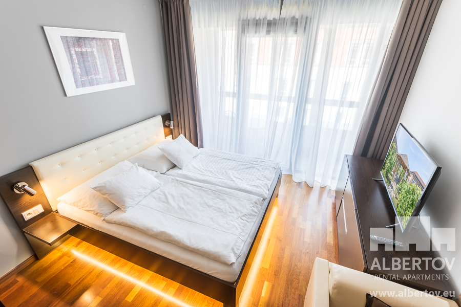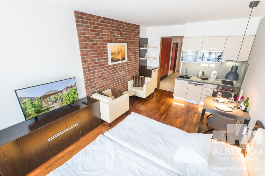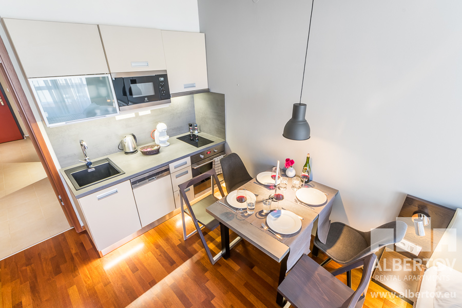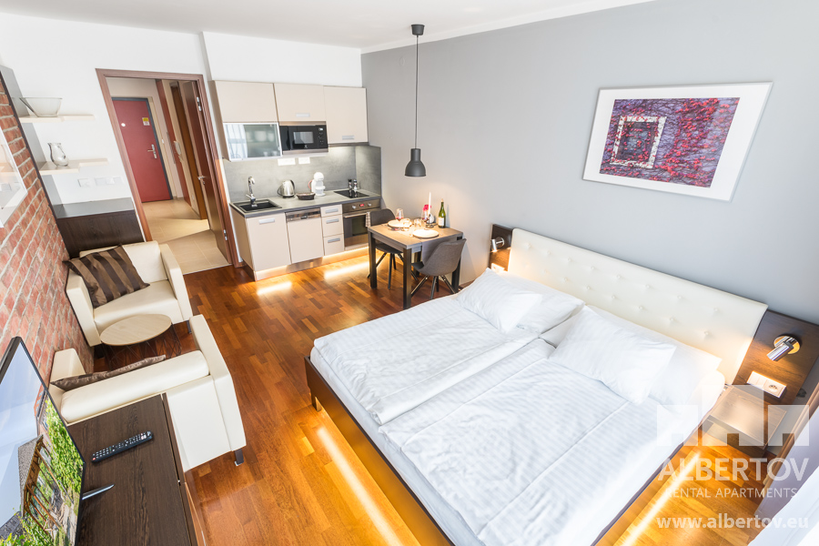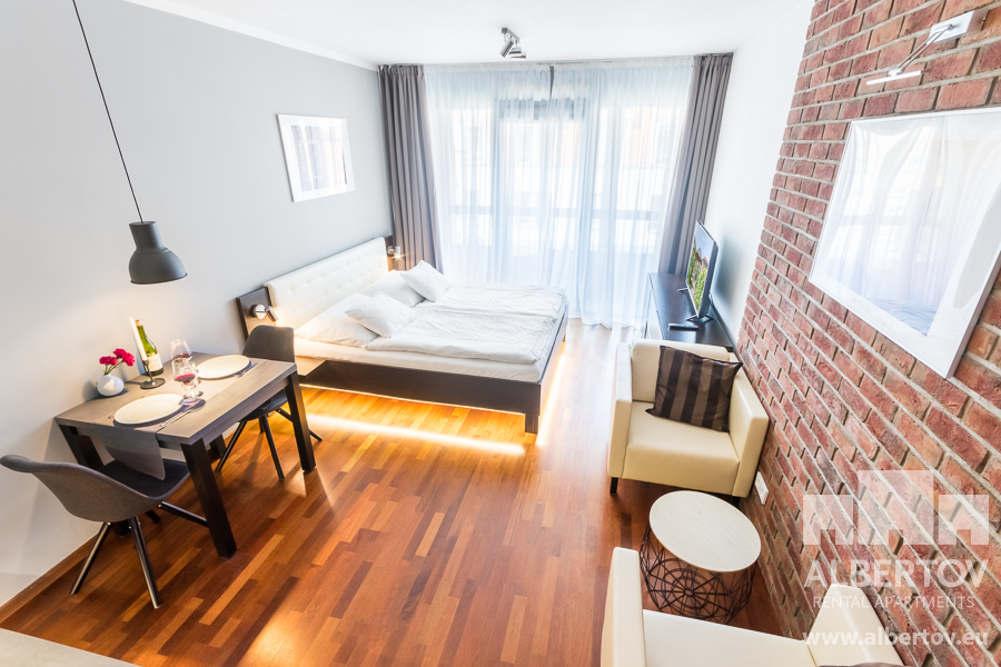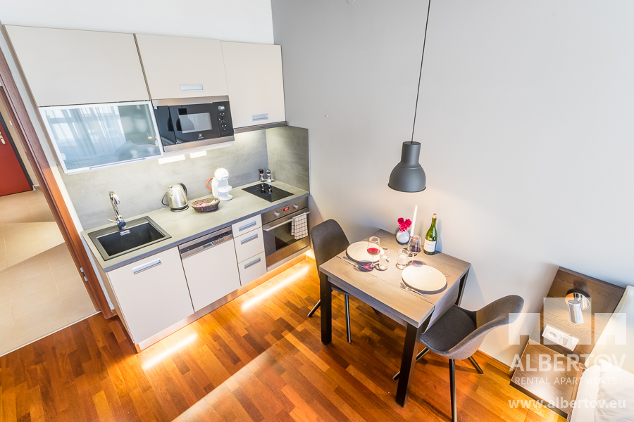 Damit das Wohnen für Sie angenehm ist, ist die ganze Wohnung modern mit Designmöbeln, mit bequemen Hockern und Lehnstühlen, eingerichtet. Im Zimmer gibt es Holzboden mit Heizung und hochwertige Holzfenster, Sie werden sich so gemütlich und warm fühlen! Zur Unterhaltung sorgt der Fernseher mit Satellit mit Hunderten von tschechischen und ausländischen Fernsehkanälen und ein schneller WiFi-Internetanschluss.
