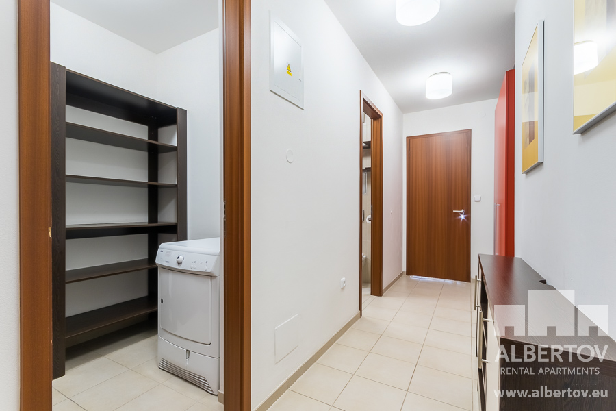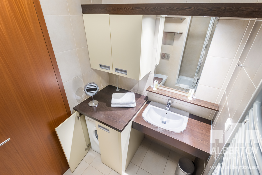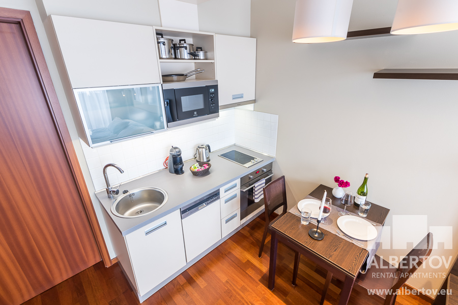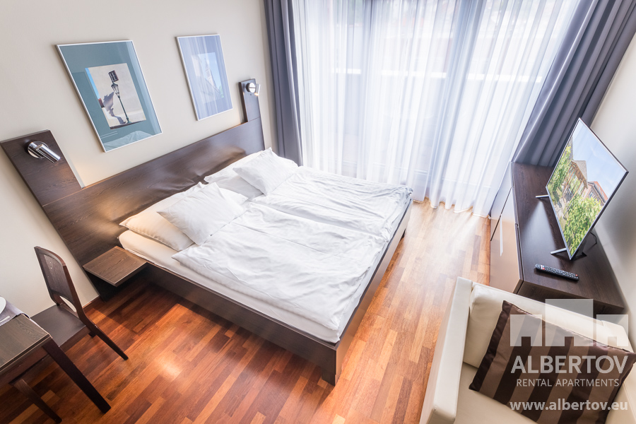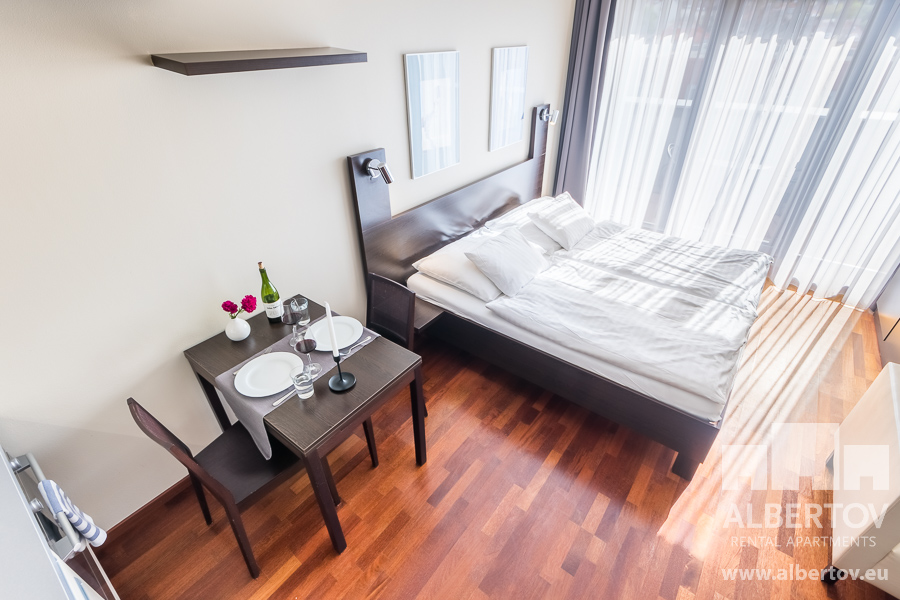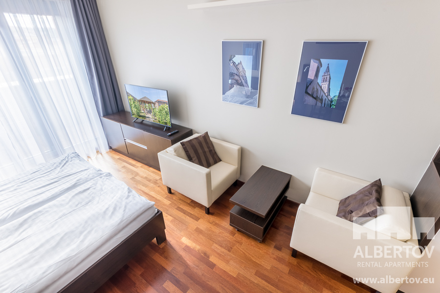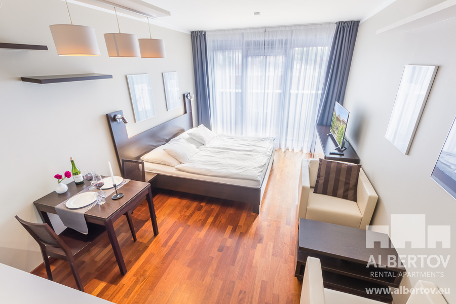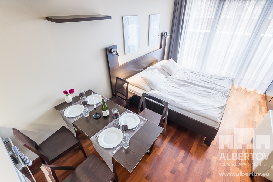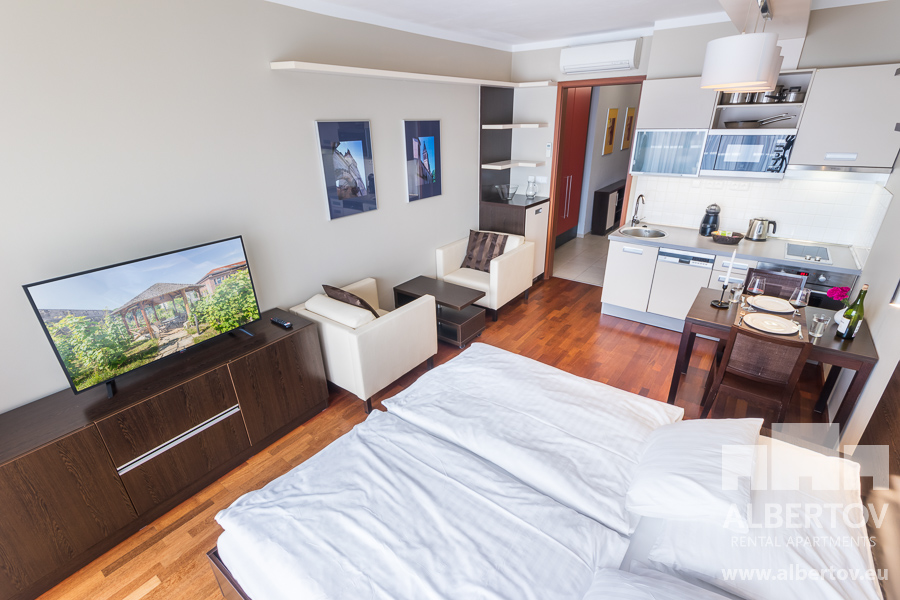 Damit das Wohnen für Sie angenehm ist, ist die ganze Wohnung modern mit Designmöbeln, mit bequemen Hockern und Lehnstühlen, eingerichtet. Im Zimmer gibt es Holzboden mit Heizung und hochwertige Holzfenster, Sie werden sich so gemütlich und warm fühlen! Zur Unterhaltung sorgt der Fernseher mit Satellit mit Hunderten von tschechischen und ausländischen Fernsehkanälen und ein schneller WiFi-Internetanschluss.