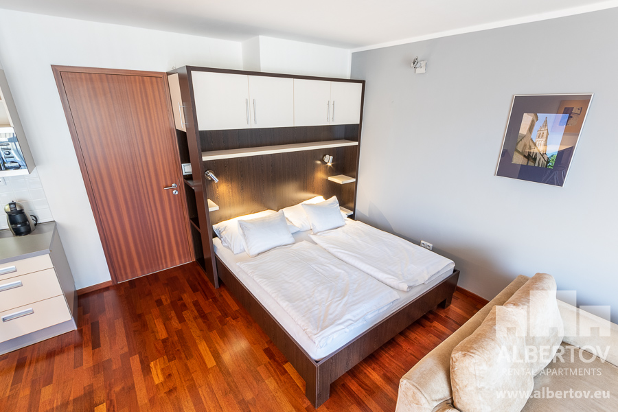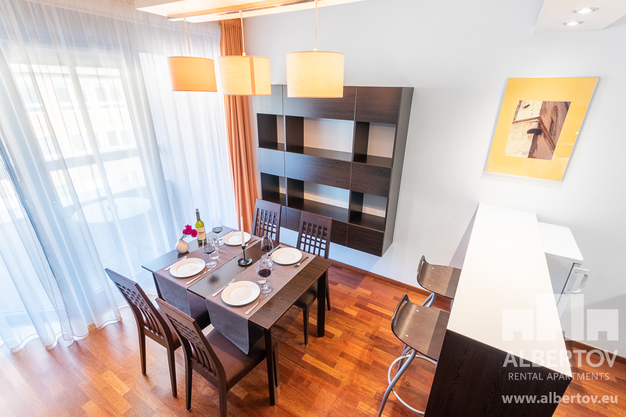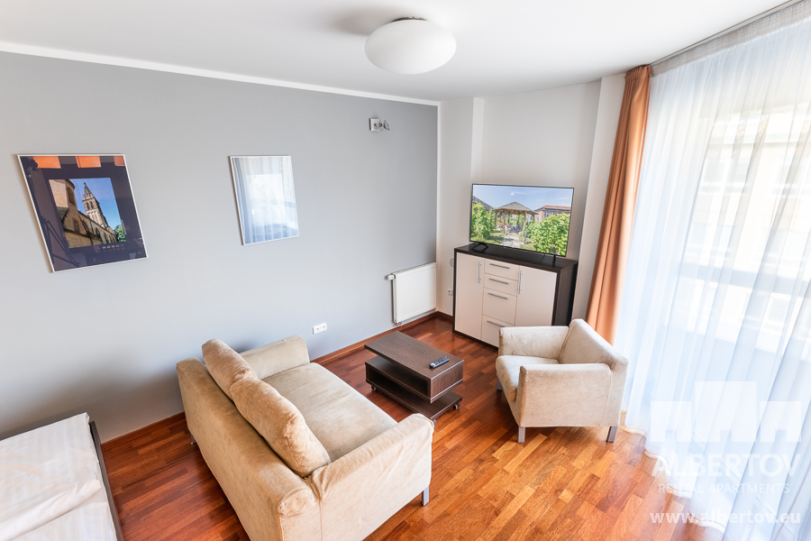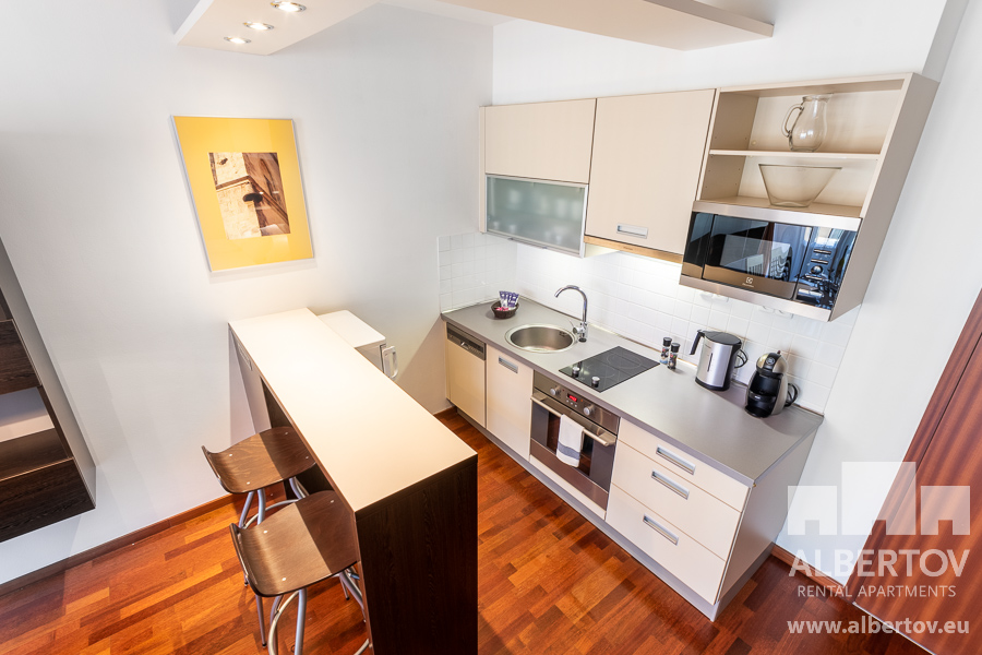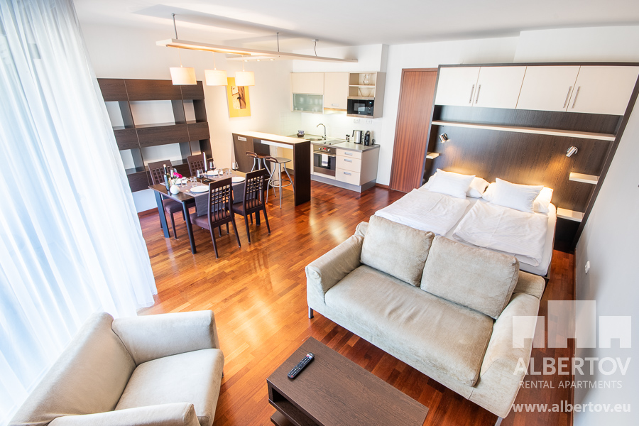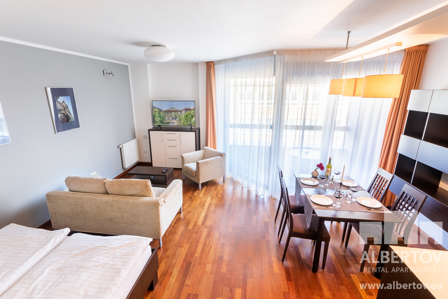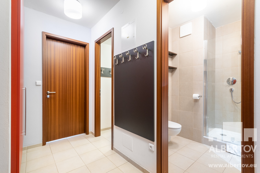 Damit das Wohnen für Sie angenehm ist, ist die ganze Wohnung modern mit Designmöbeln, mit bequemen Hockern und Lehnstühlen, eingerichtet. Im Zimmer gibt es Holzboden mit Heizung und hochwertige Holzfenster, Sie werden sich so gemütlich und warm fühlen! Zur Unterhaltung sorgt der Fernseher mit Satellit mit Hunderten von tschechischen und ausländischen Fernsehkanälen und ein schneller WiFi-Internetanschluss.