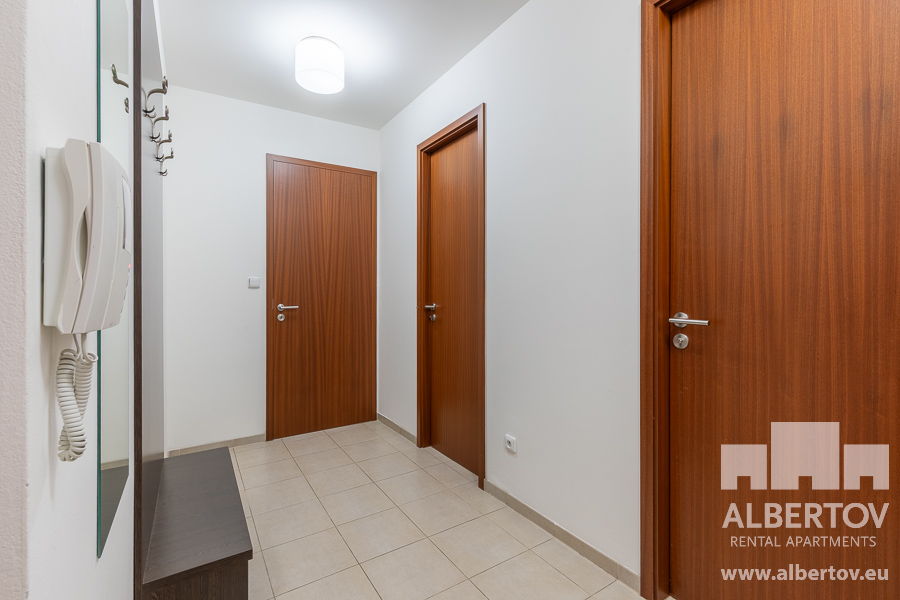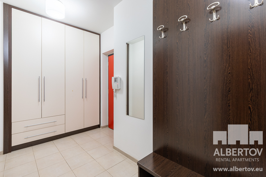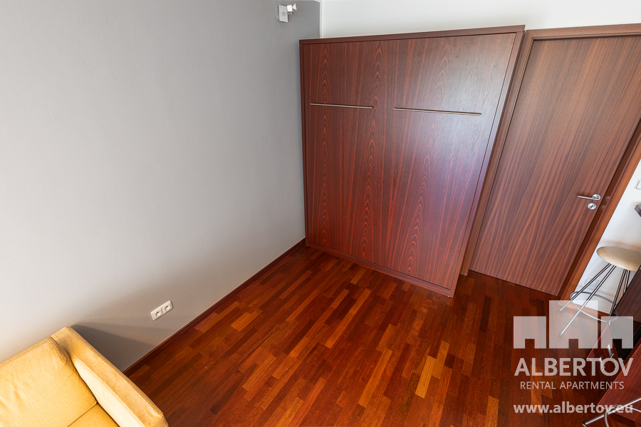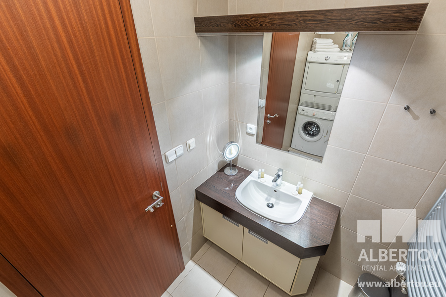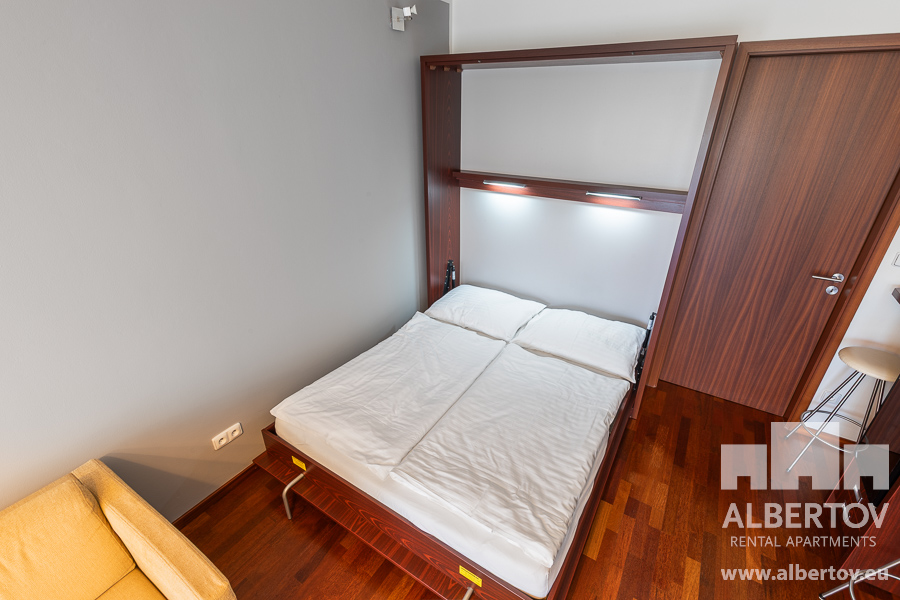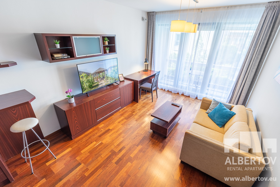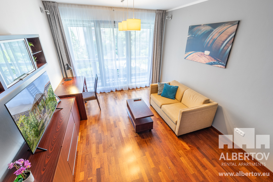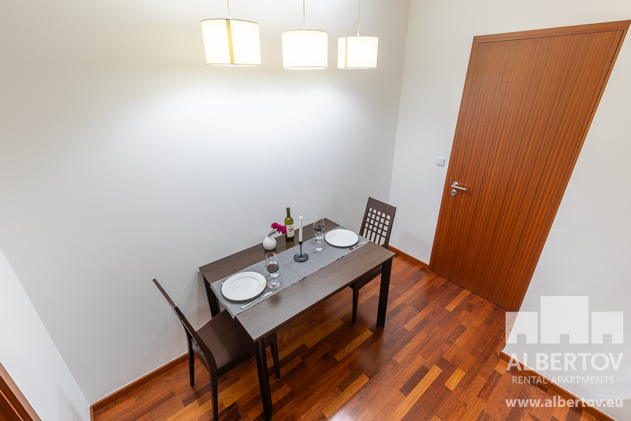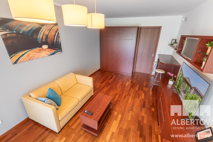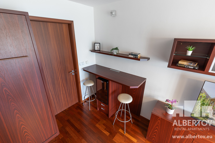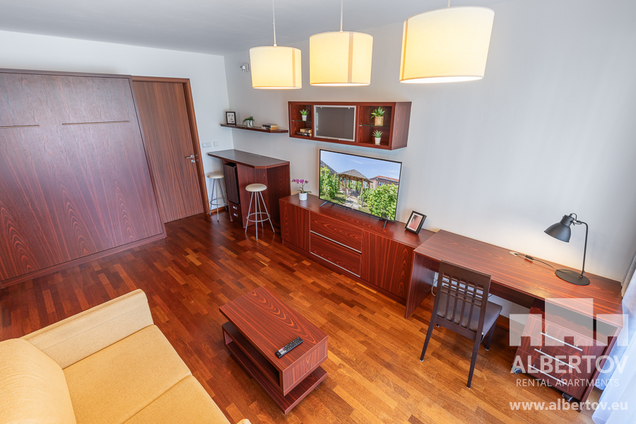 Damit das Wohnen für Sie angenehm ist, ist die ganze Wohnung modern mit Designmöbeln, mit bequemen Hockern und Lehnstühlen, eingerichtet. Im Zimmer gibt es Holzboden mit Heizung und hochwertige Holzfenster, Sie werden sich so gemütlich und warm fühlen! Zur Unterhaltung sorgt der Fernseher mit Satellit mit Hunderten von tschechischen und ausländischen Fernsehkanälen und ein schneller WiFi-Internetanschluss.