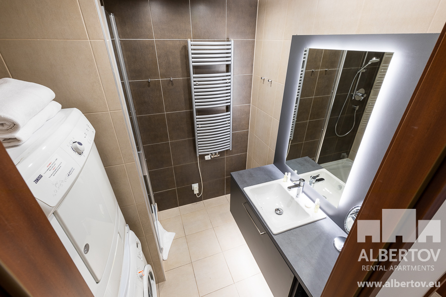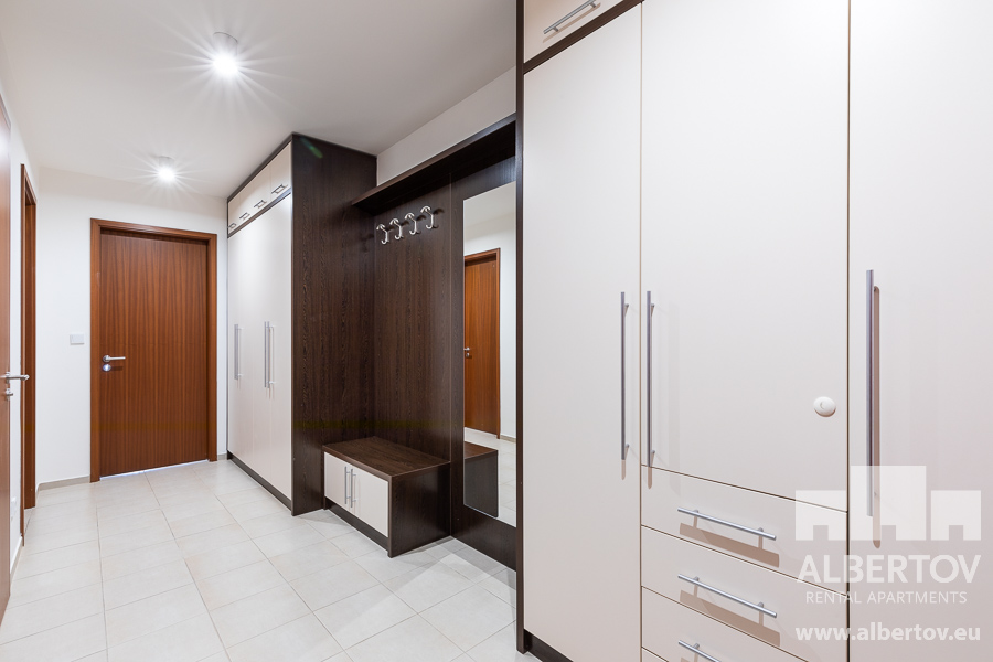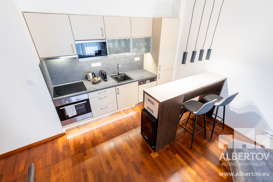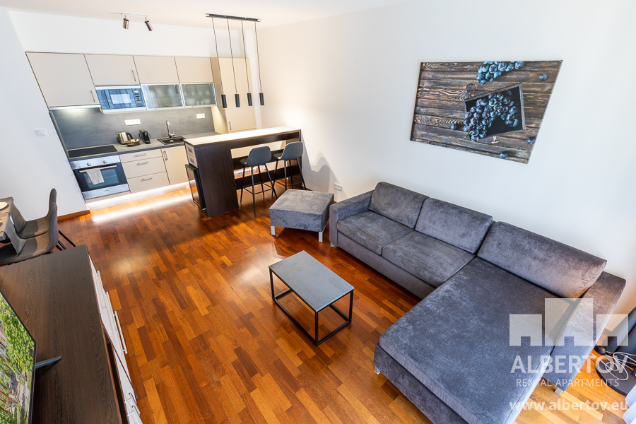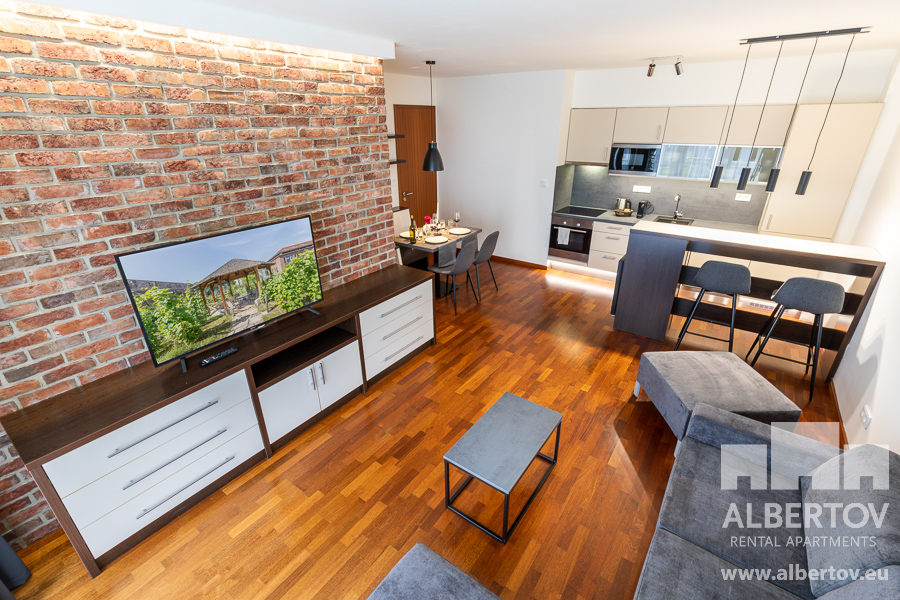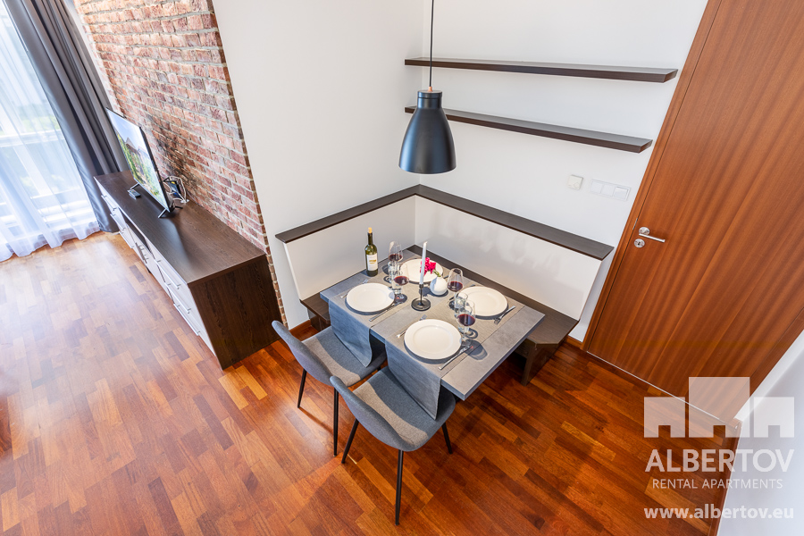 Damit das Wohnen für Sie angenehm ist, ist die ganze Wohnung modern mit Designmöbeln, mit bequemen Hockern und Lehnstühlen, eingerichtet. Im Zimmer gibt es Holzboden mit Heizung und hochwertige Holzfenster, Sie werden sich so gemütlich und warm fühlen! Zur Unterhaltung sorgt der Fernseher mit Satellit mit Hunderten von tschechischen und ausländischen Fernsehkanälen und ein schneller WiFi-Internetanschluss.
