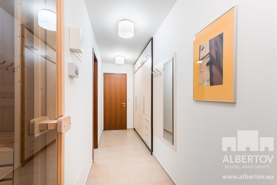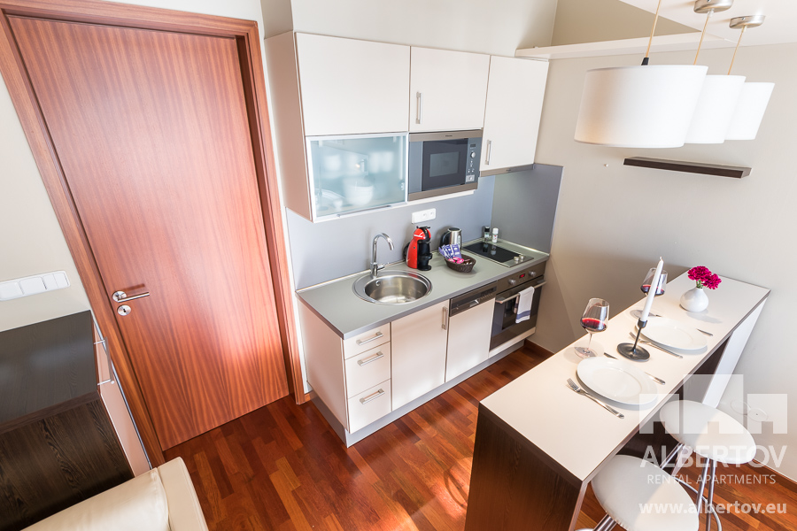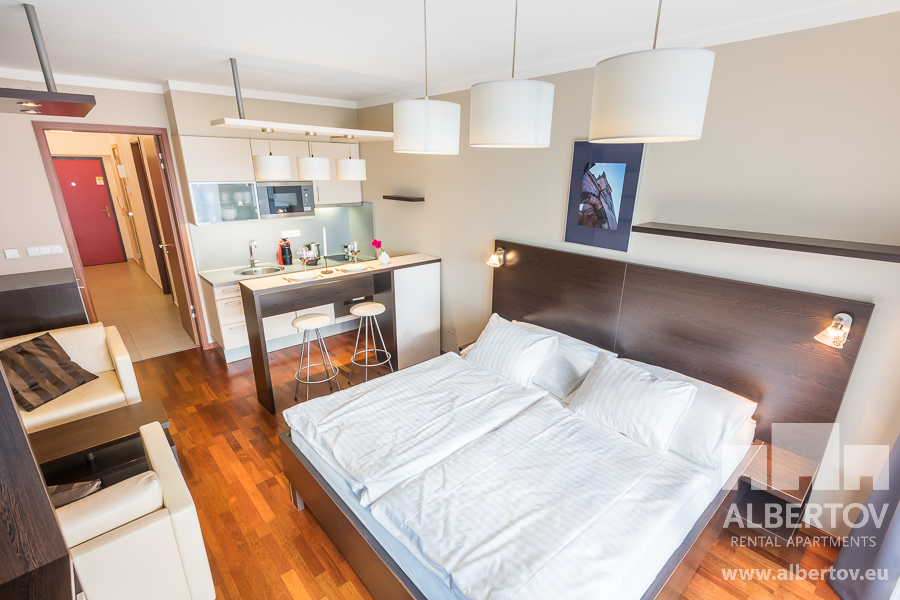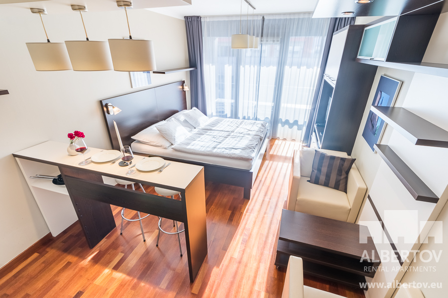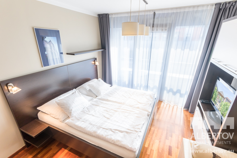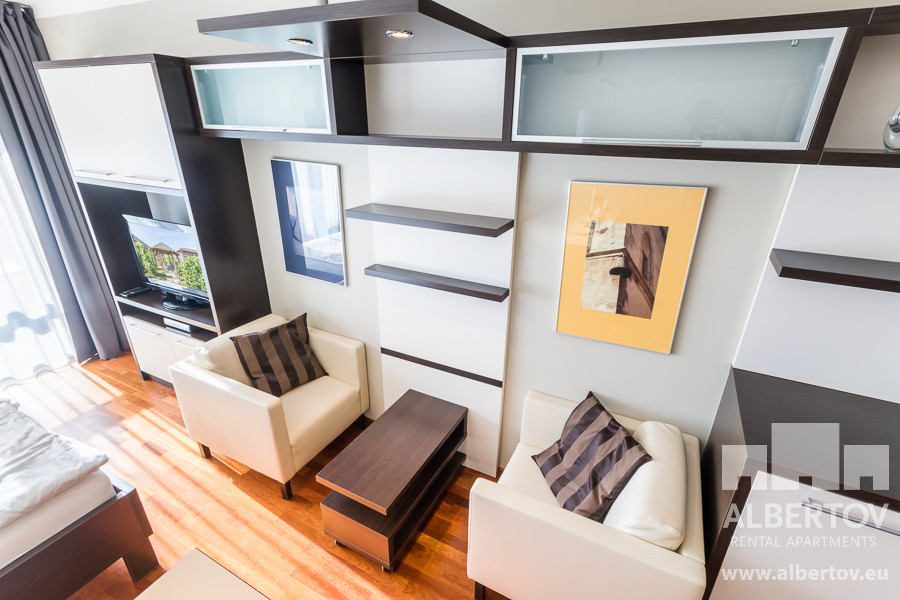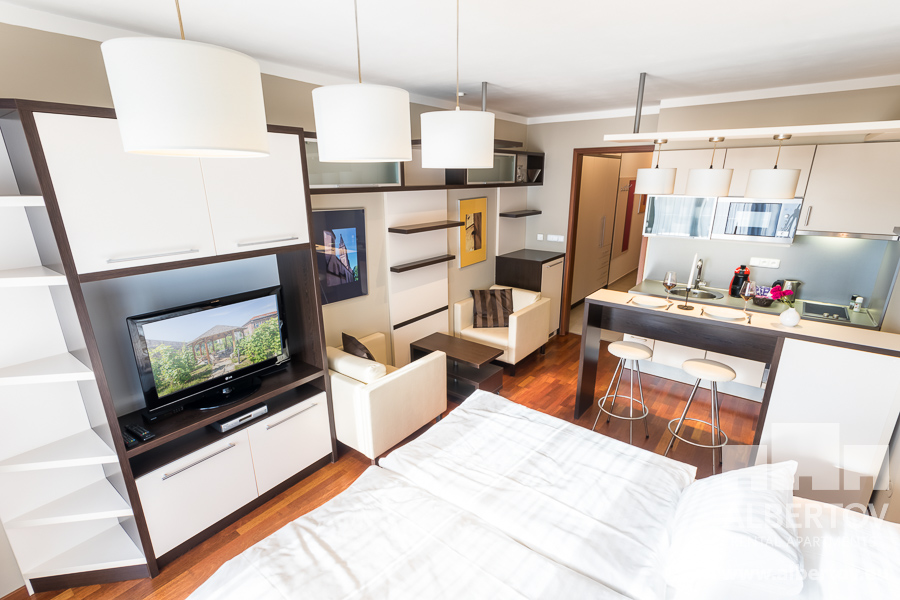 Damit das Wohnen für Sie angenehm ist, ist die ganze Wohnung modern mit Designmöbeln, mit bequemen Hockern und Lehnstühlen, eingerichtet. Im Zimmer gibt es Holzboden mit Heizung und hochwertige Holzfenster, Sie werden sich so gemütlich und warm fühlen! Zur Unterhaltung sorgt der Fernseher mit Satellit mit Hunderten von tschechischen und ausländischen Fernsehkanälen und ein schneller WiFi-Internetanschluss.